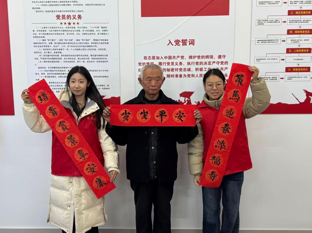 活动现场,志愿者们聚焦老年人反诈需求痛点,通过生动直观的PPT演示,深入揭露保健品推销、虚假投资等常见骗局的套路和陷阱。志愿者们耐心细致地手把手教学,帮助老年人掌握识别诈骗信息的核心技巧,同时向村民逐一发放反诈宣传页,用通俗易懂的语言强化防范意识,筑牢乡村反诈“安全网”。反诈宣讲环节结束后,中华优秀传统文化传播环节温情启幕。刘耀辉教授结合自身专业积淀,深入浅出地解读书法艺术背后的中华文化底蕴,让在场村民与书法爱好者深刻感受传统艺术的独特魅力。在刘教授的现场指导下,书法爱好者们挥毫泼墨,一笔一划间饱含对新年的美好憧憬,墨香萦绕的活动现场洋溢着浓厚的文化气息与节日氛围。随后,志愿者们将一副副寓意吉祥的春联与精心筹备的慰问礼品送到村民手中,让大家在收获文化滋养的同时,切实感受到来自学院的贴心关怀。“不仅学会了怎么防骗,还拿到了喜庆的春联,这个活动太实在了!”活动结束后,村民们纷纷点赞,直言在学到实用反诈知识的同时,也感受到了浓浓的年味与温暖。此次创新推出的“数字助老+墨香送福”志愿服务模式,既有效提升了乡村老年人的风险防范能力,又让中华优秀传统文化在基层实践中焕发新生机,实现了公益服务与文化传承的双向赋能。