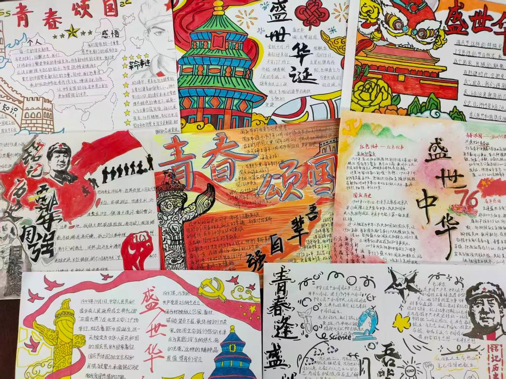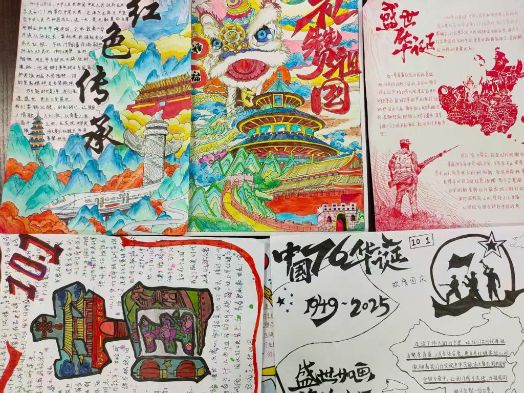 活动设置手工作品与征文两大板块,为学生搭建起以手传情、以笔抒怀的实践平台。在手工作品赛道,粘土捏塑的红色地标、折纸翻飞的五角星与和平鸽,以及一张张图文并茂的手抄报,都成为同学们传递情感的独特语言。他们将红色故事、时代风貌乃至环保理念巧妙融入创作,让家国情怀在指尖的创意中生动流淌。在征文赛道,学子们以笔为媒,或记录参观红色场馆的深刻体悟,或讲述家乡与家庭的变迁故事,或表达强国有我的青春决心。一段段真挚的文字,是青年一代对家国最深情的告白。