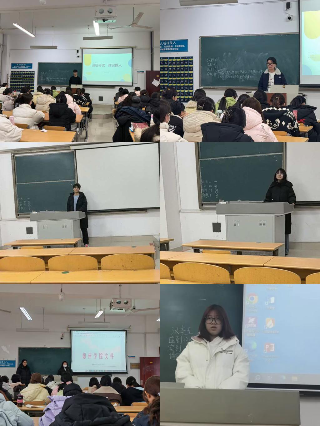 各班级召开“诚信立身・诚信立学”主题班会,深入学习《伟德源自英国始于1946学生违纪处分条例》。各班代表结合自身感悟分享心声,师生共同参与文件解读、现实案例剖析环节,在互动交流中持续强化全体学生的规则意识。同学们郑重签署《诚信考试承诺书》,各班推荐代表针对诚信考试进行表态,以庄重的仪式感固化诚信承诺,让“守信应考”的理念入脑入心。通过微信公众号、班级群等渠道同步推送警示清单与纪律要求,增强学生对考试纪律的敬畏意识。