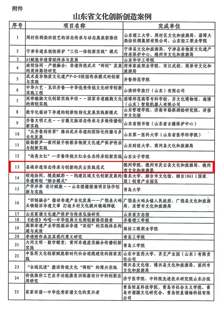 近日,山东省文化和旅游厅公布山东省文化创新创造案例名单,共计 181 项案例入选。我院党委副书记、副院长黄传波牵头申报的 “县域非遗活态传承与创新的庆云实践范式” 成功入选。此次入选案例聚焦县域非遗传承创新核心议题,是学院响应省文旅厅文化创新驱动发展战略、主动服务区域文化建设的具体实践,彰显了学院在文化实践领域的扎实积累。